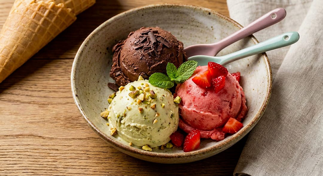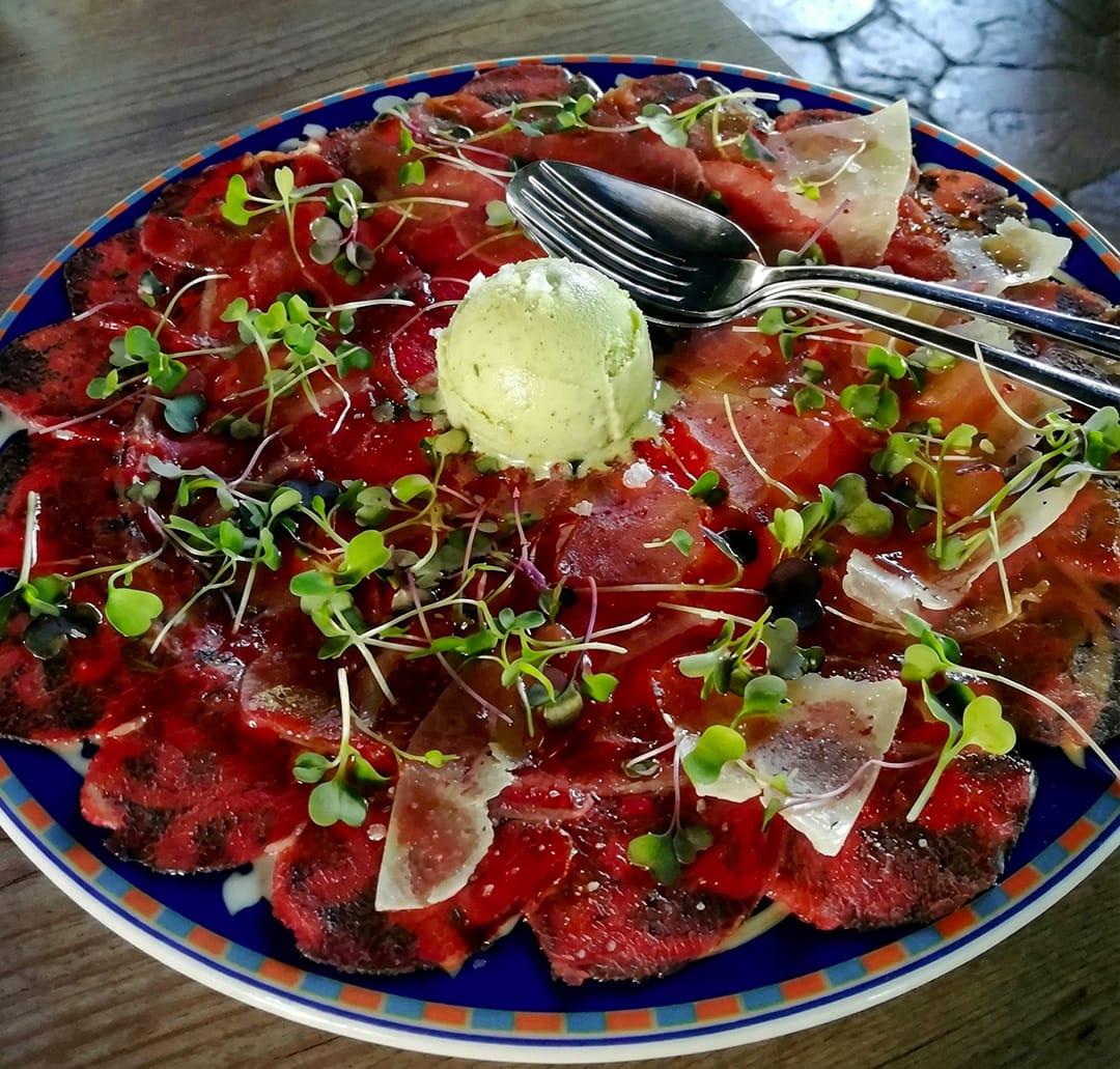 Centro de carpaccio de novilla de la Sierra de Cantabria con lascas de Idiazabal, sal de Añana y helado de aceite de oliva virgen extra arróniz KM.0