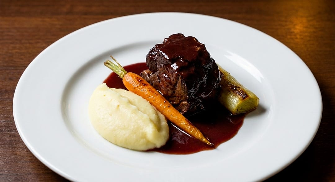 Carrillera de vaca estofada al vino tinto con su guarnición KM.0
