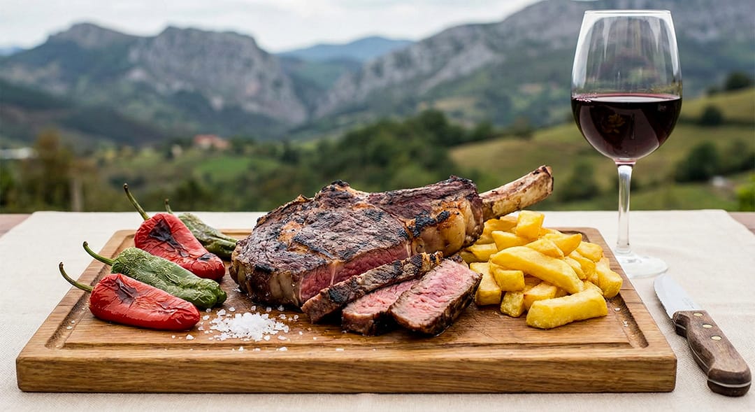 Chuleta de vaca de Montaña Alavesa a la brasa con pimientos asados al sarmiento y patatas fritas de Álava KM.0