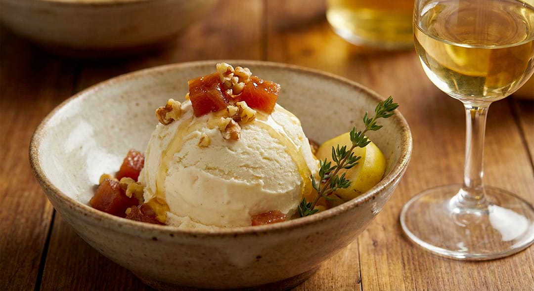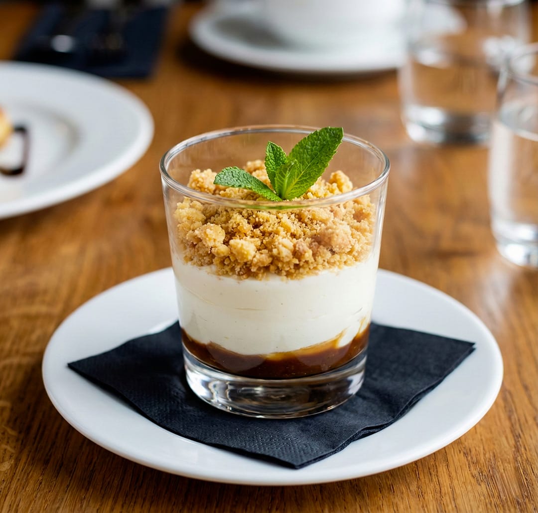 Cremoso de queso al revés, crumble crujiente, Fresaraba y vino