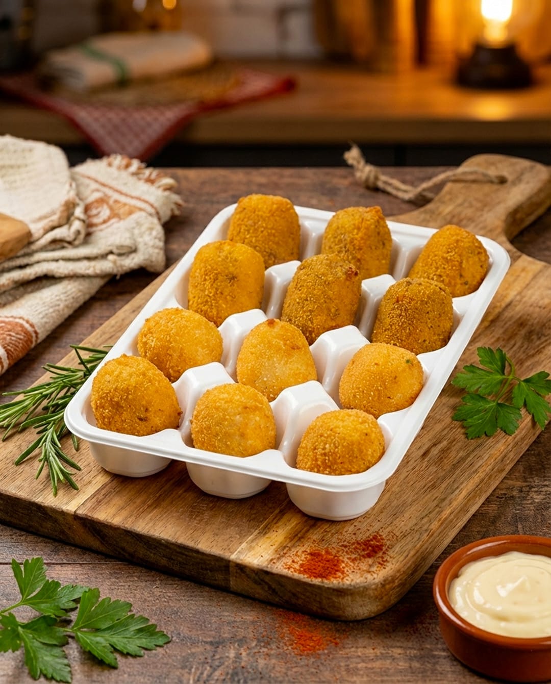 Centro de croquetas artesanas de chuleta a la brasa sobre huevera KM.0