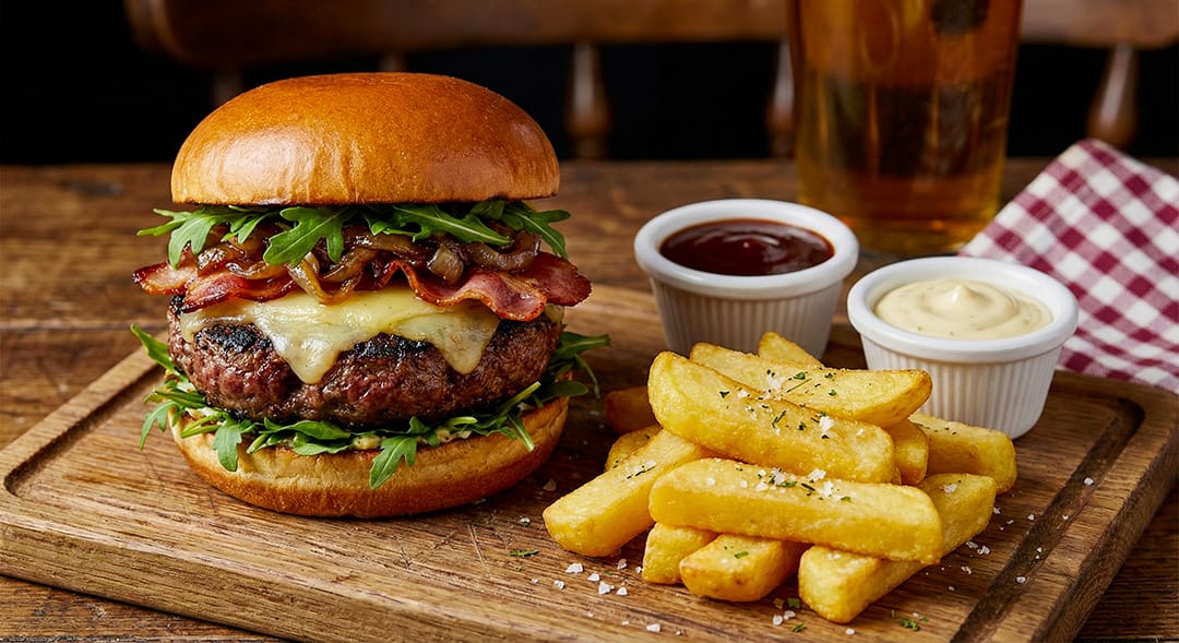 Hamburguesa artesana de carne de ganado mayor a la brasa; dos salsas y patatas fritas de Llanada Alavesa KM.0