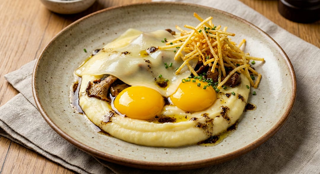 Nuestras yemas de huevo de caserío, aceite de trufa de Montaña Alavesa, lámina de queso fundente, parmentier, setas y patatas paja de Álava KM.0